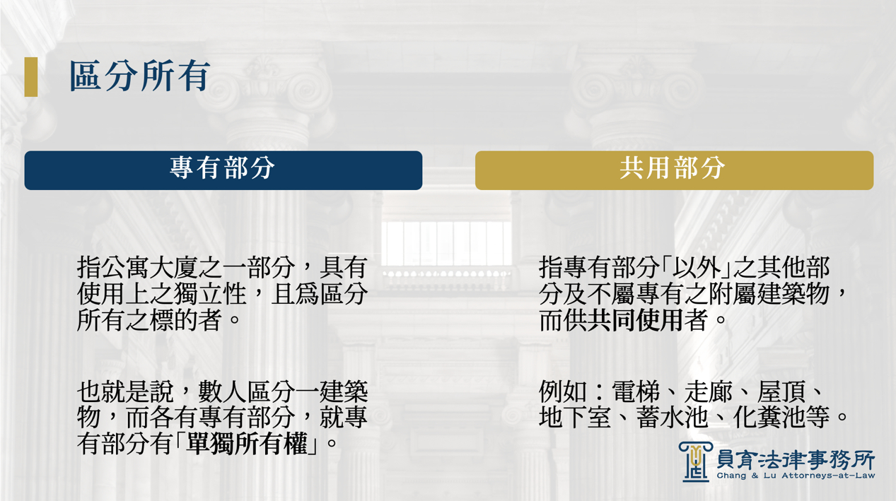 因此可以得知,區分所有是由專有部分與共用部分所構成的:
