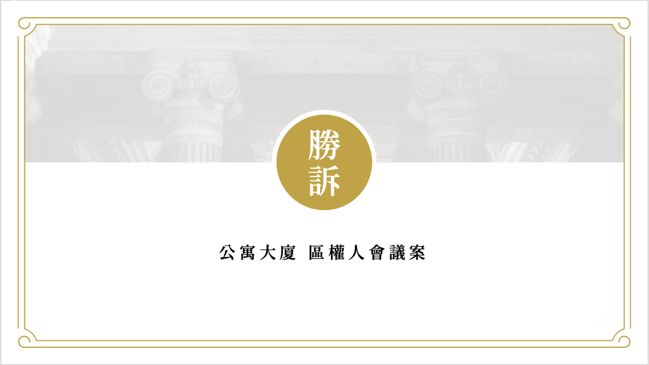 本件勝訴案例涉及公寓大廈區分所有權人會議之決議事宜,在地狹人稠的現今,社區大樓是非常普遍的,大樓之住戶即是區分所有權人,因此則可能衍生出區分所有權會議之相關爭議,亦即共同事務、住戶權利義務之有關事項,本文分享區權人會議案之二審勝訴案例:
