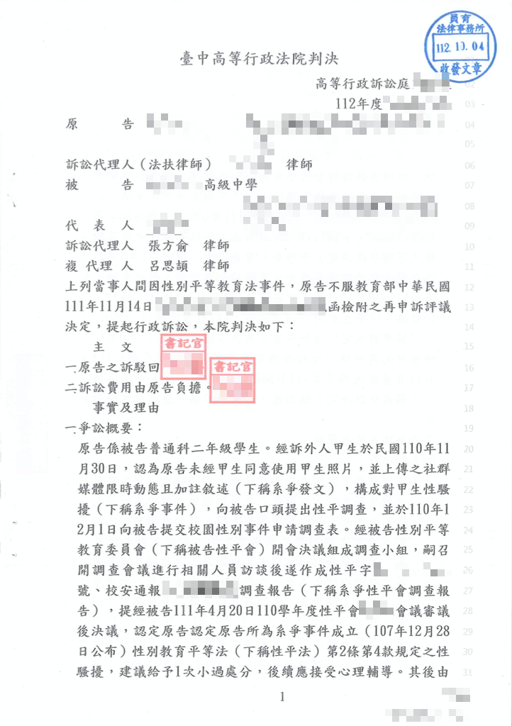 校園性騷擾案-勝訴案例 | 台中律師事務所,南區律師事務所,南區律師