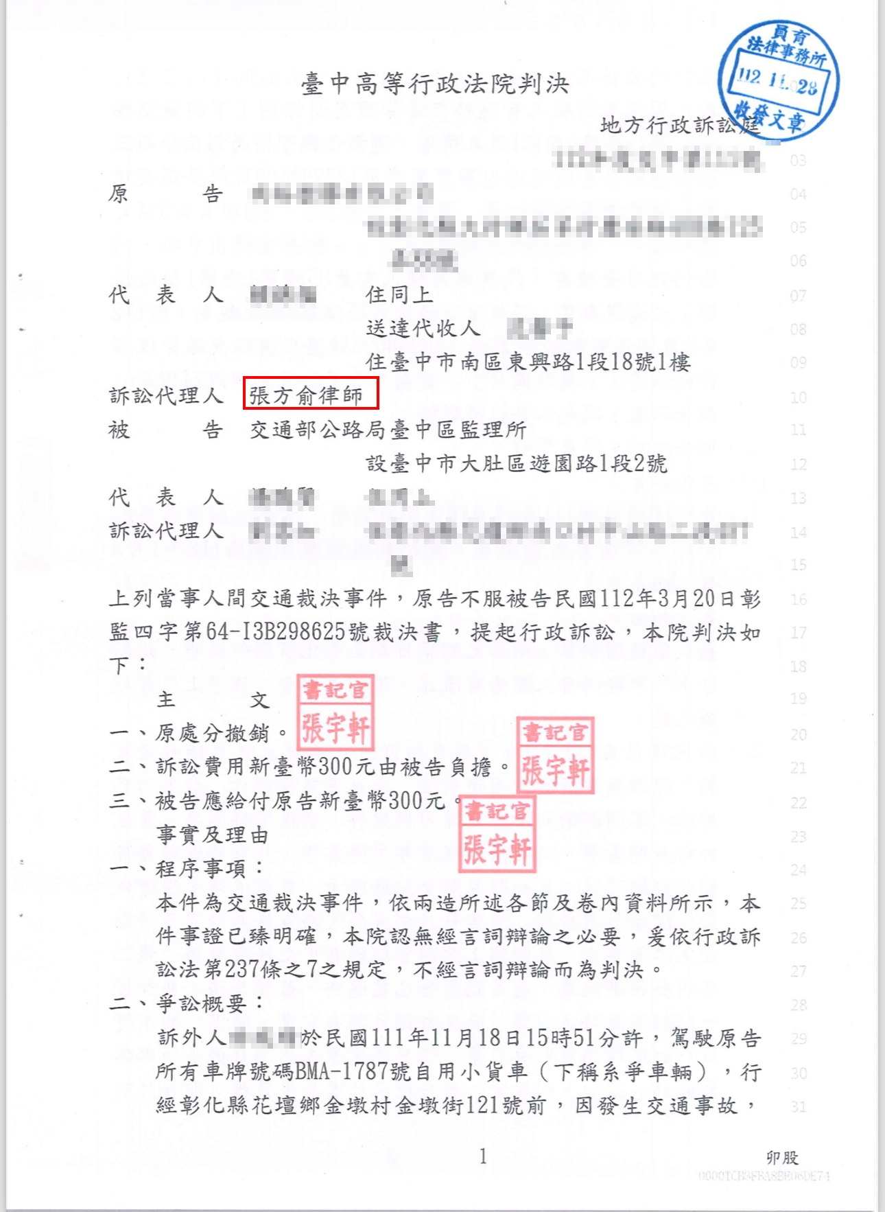 本所客戶的公司車,因員工酒駕受吊扣之行政處分,張方俞律師及呂思頡律師協助客戶提起行政訴訟,成功讓吊扣的行政處分撤銷: