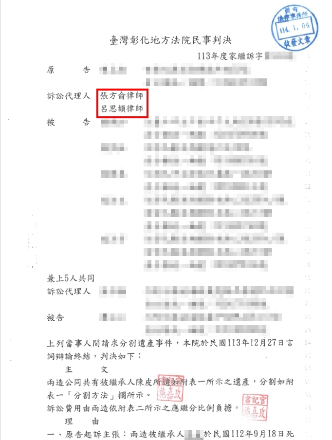 原告(本所客戶)主張被繼承人死亡後留下多筆彰化的土地與存款,但全體繼承人一直無法協議分割,所以請求法院以裁判分割。