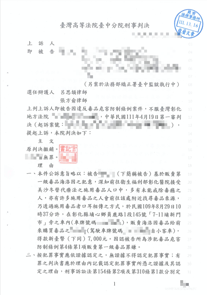 販賣一級毒品案-上訴獲勝 案例分享 | 台中律師事務所,南區律師事務所,南區毒品訴訟律師